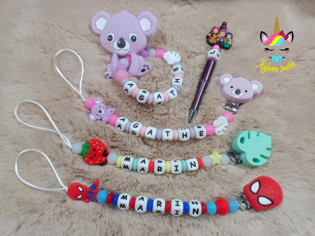 2 Attaches tétines + 1 Attache tétine Idole + 1 Hochet + 1 Stylo avec recharge