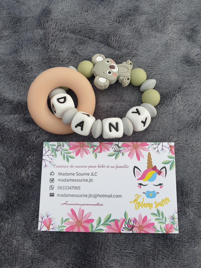 Respect des normes CE, composée de perles silicone alimentaire et/ou bois naturel.