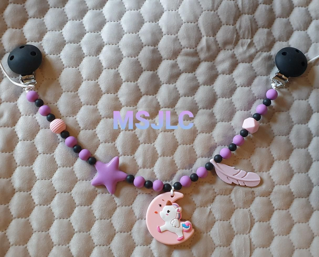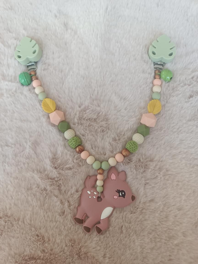 Respect des normes CE, composée de perles silicone alimentaire et/ou bois naturel.