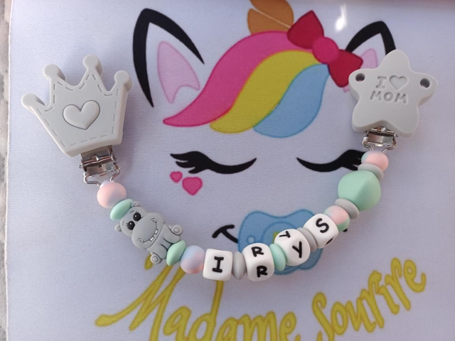 Une Attache doudou pour ne plus perdre le doudou avec deux clips pour accrocher aux tissus sans les abîmer, un pour le vêtement, l'autre au doudou.