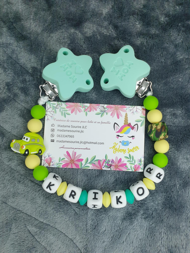 Respect des normes CE, composée de perles silicone alimentaire et/ou bois naturel.