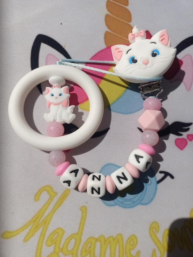Une Attache tétine pour ne plus perdre la tétine avec une boucle pour attacher celle-ci (adaptateur MAM disponible pour les tétines MAM dans les accessoires) et un clip pour accrocher l'attache à un tissu sans l'abîmer doublé d'un anneau dentition.