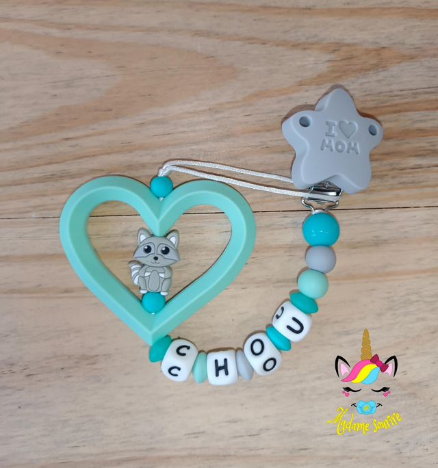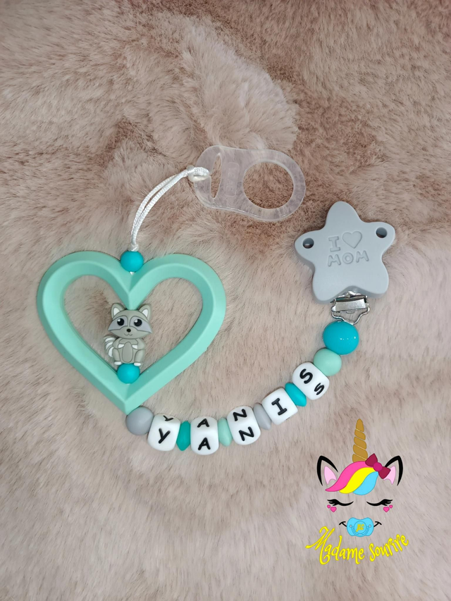 Une Attache tétine pour ne plus perdre la tétine avec une boucle pour attacher celle-ci (adaptateur MAM disponible pour les tétines MAM dans les accessoires) et un clip pour accrocher l'attache à un tissu sans l'abîmer doublé d'un anneau dentition.