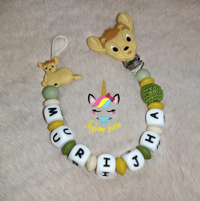 Respect des normes CE, composée de perles silicone alimentaire et/ou bois naturel.
