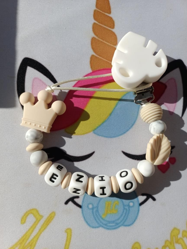 Respect des normes CE, composée de perles silicone alimentaire et/ou bois naturel.
