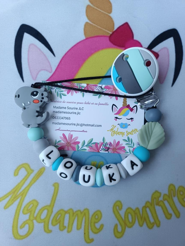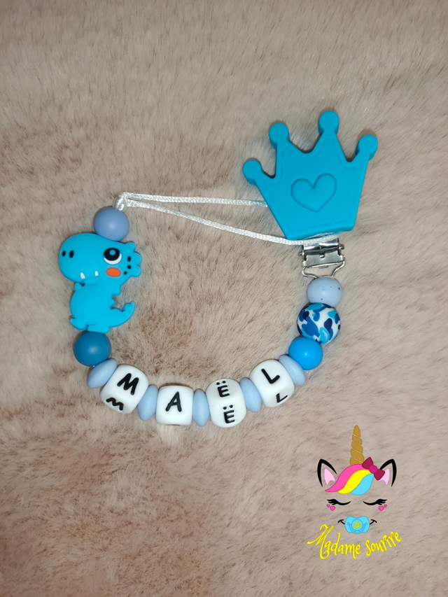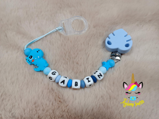 Une Attache tétine pour ne plus perdre la tétine avec une boucle pour attacher celle-ci (adaptateur MAM disponible pour les tétines MAM dans les accessoires) et un clip pour accrocher l'attache à un tissu sans l'abîmer.