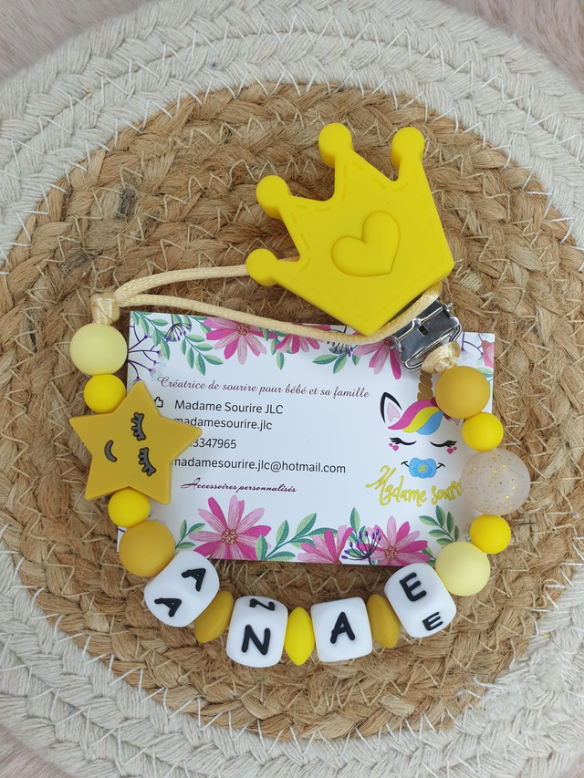 Respect des normes CE, composée de perles silicone alimentaire et/ou bois naturel.