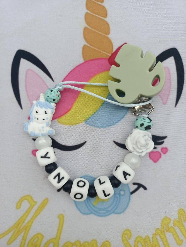 Une Attache tétine pour ne plus perdre la tétine avec une boucle pour attacher celle-ci (adaptateur MAM disponible pour les tétines MAM dans les accessoires) et un clip pour accrocher l'attache à un tissu sans l'abîmer.