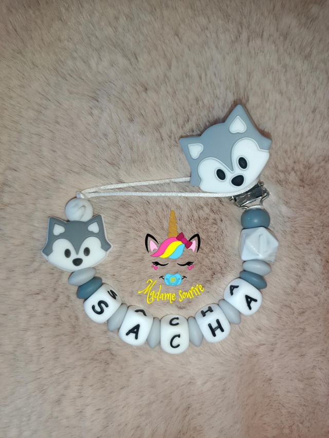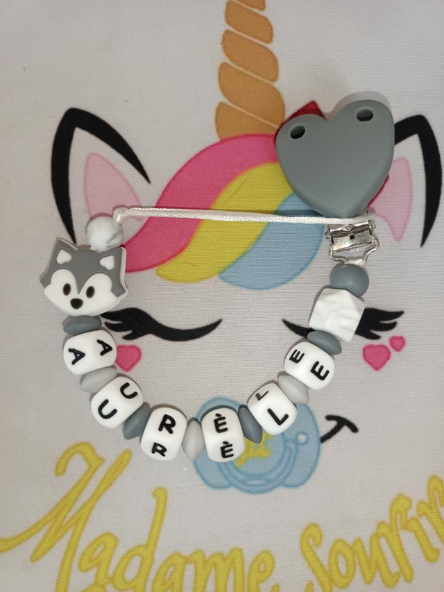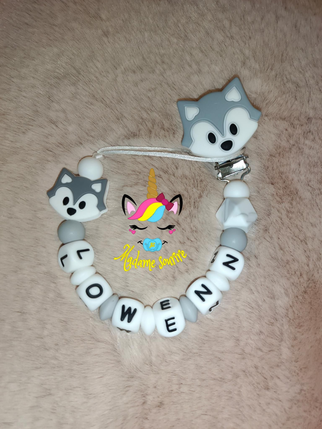 Une Attache tétine pour ne plus perdre la tétine avec une boucle pour attacher celle-ci (adaptateur MAM disponible pour les tétines MAM dans les accessoires) et un clip pour accrocher l'attache à un tissu sans l'abîmer.