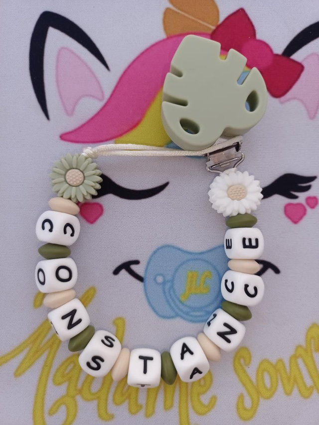 Respect des normes CE, composée de perles silicone alimentaire et/ou bois naturel.