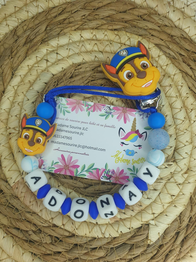 Une Attache tétine pour ne plus perdre la tétine avec une boucle pour attacher celle-ci (adaptateur MAM disponible pour les tétines MAM dans les accessoires) et un clip pour accrocher l'attache à un tissu sans l'abîmer.