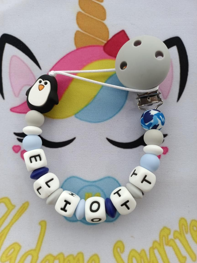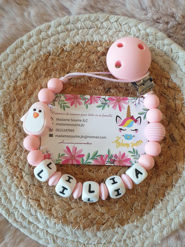 Une Attache tétine pour ne plus perdre la tétine avec une boucle pour attacher celle-ci (adaptateur MAM disponible pour les tétines MAM dans les accessoires) et un clip pour accrocher l'attache à un tissu sans l'abîmer.