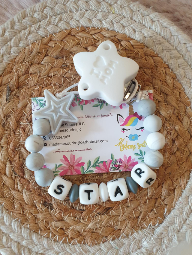 Respect des normes CE, composée de perles silicone alimentaire et/ou bois naturel.
