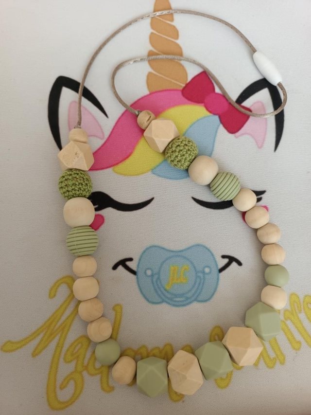 Respect des normes CE, composée de perles silicone alimentaire et/ou bois naturel.