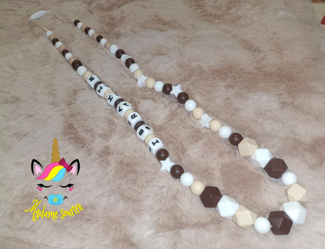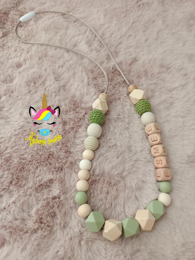 Respect des normes CE, composée de perles silicone alimentaire et/ou bois naturel.