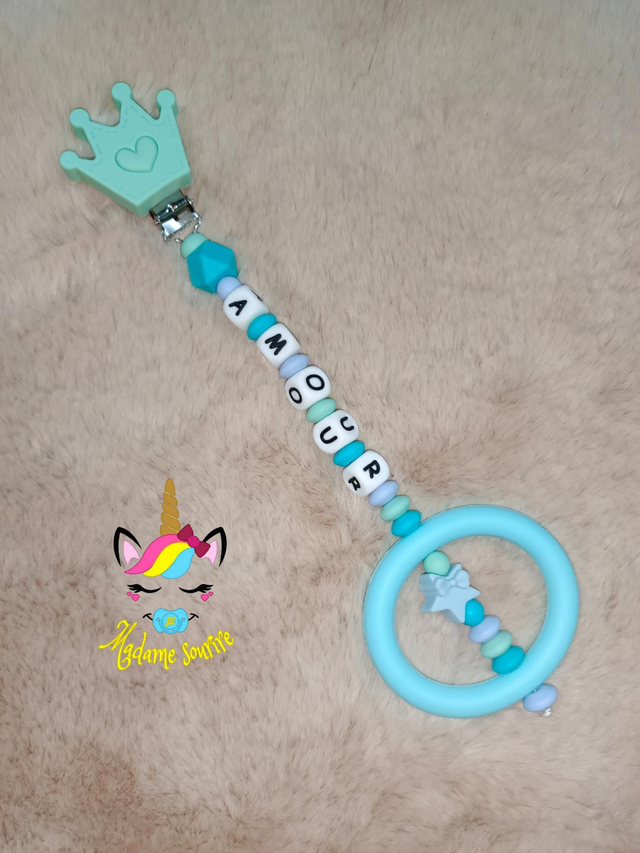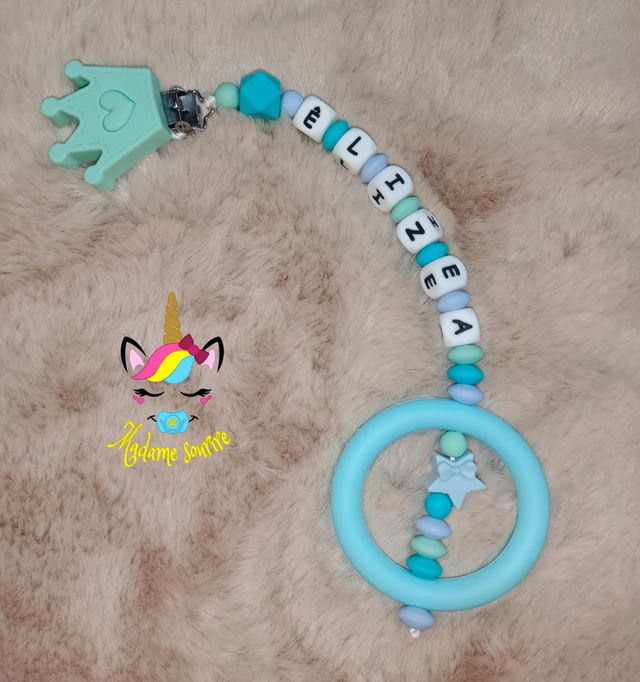 Respect des normes CE, composée de perles silicone alimentaire et/ou bois naturel.