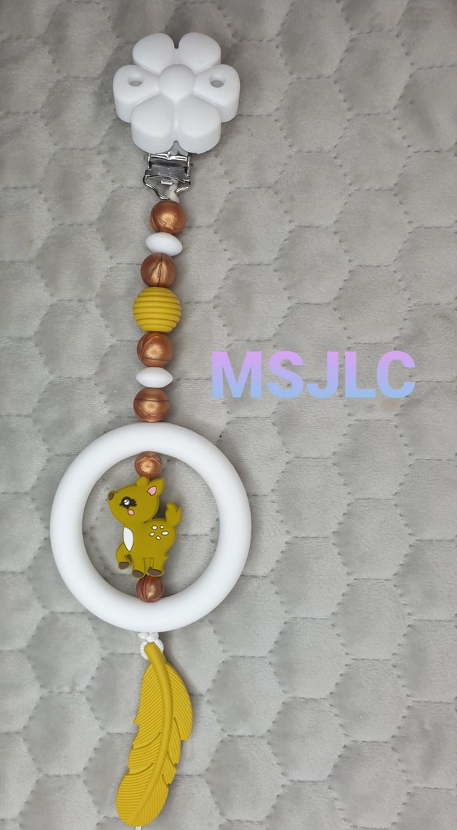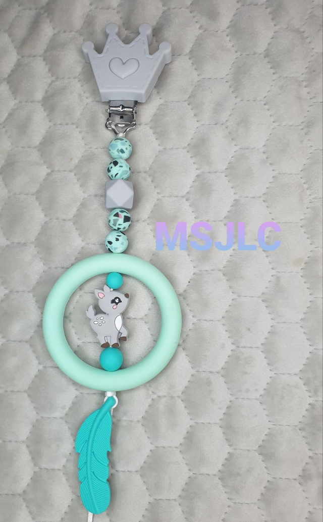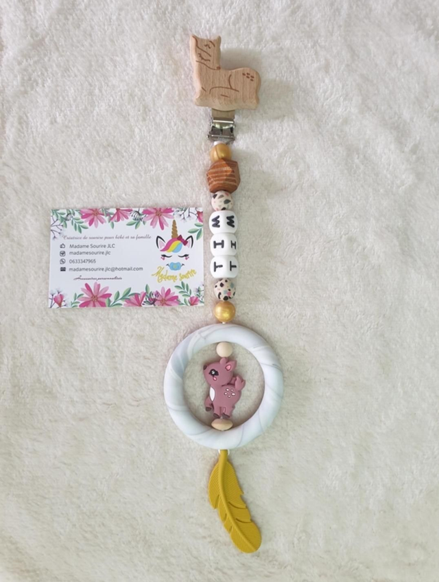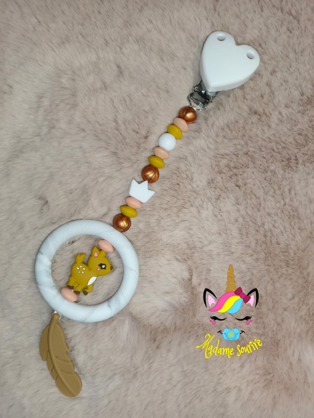 Une Suspension d'éveil pour que bébé s'occupe tout en s'amusant et même soulager ses poussées dentaires en le mâchouillant. Composée d'un clip pour accrocher au tissu sans l'abîmer, à l'extrémité, une perle entourée d'un anneau pour développer les sens de bébé.