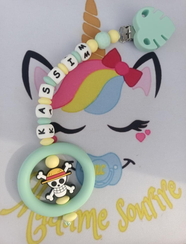 Une Suspension d'éveil pour que bébé s'occupe tout en s'amusant et même soulager ses poussées dentaires en le mâchouillant. Composée d'un clip pour accrocher au tissu sans l'abîmer, à l'extrémité, une perle entourée d'un anneau pour développer les sens de bébé.