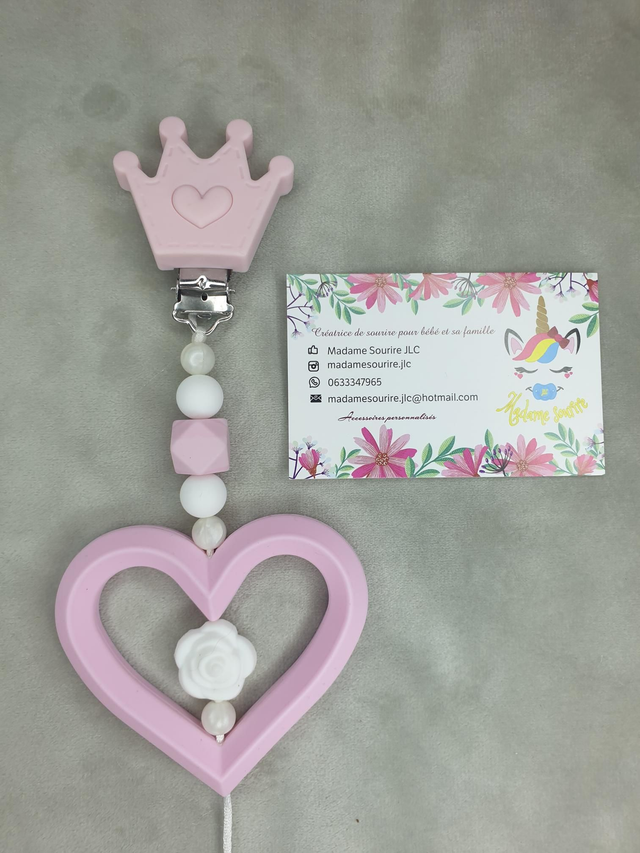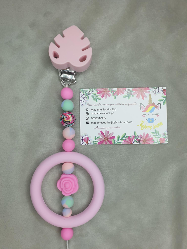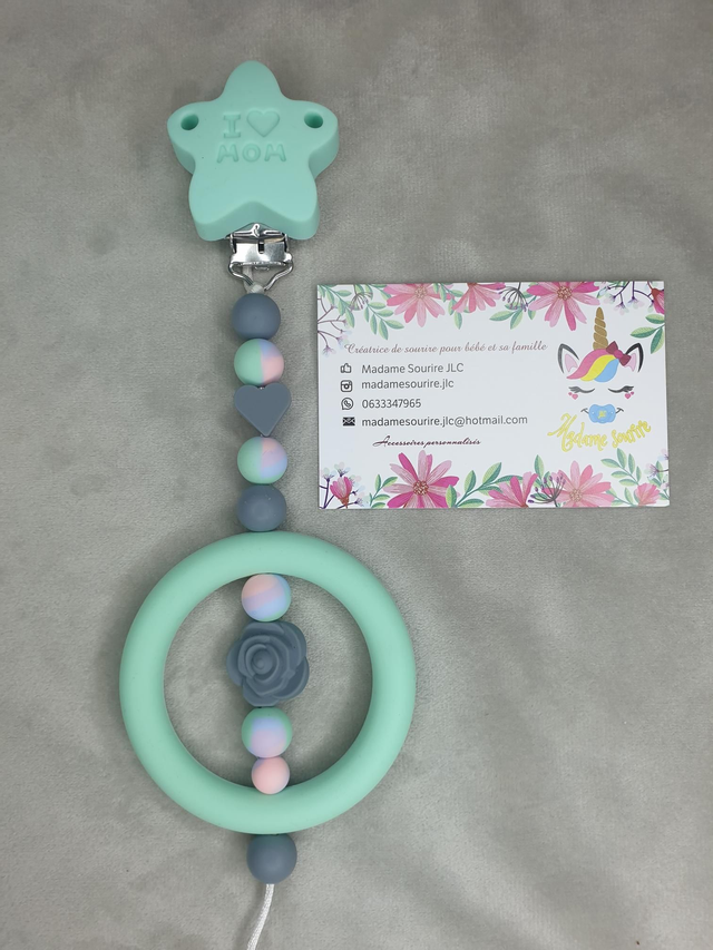 Une Suspension d'éveil pour que bébé s'occupe tout en s'amusant et même soulager ses poussées dentaires en le mâchouillant. Composée d'un clip pour accrocher au tissu sans l'abîmer, à l'extrémité, une perle entourée d'un anneau pour développer les sens de bébé.