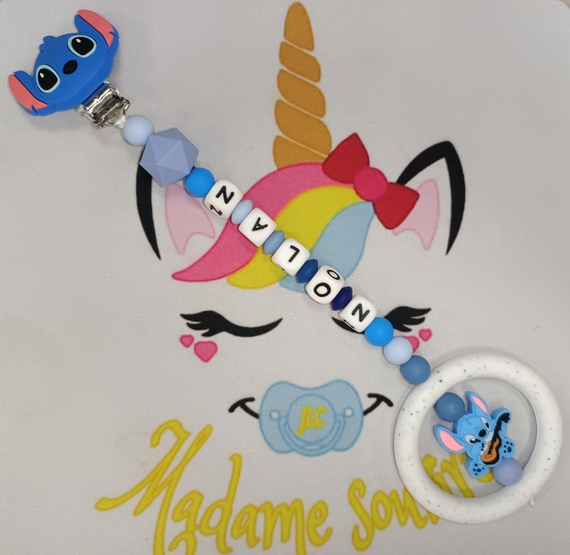 Une Suspension d'éveil pour que bébé s'occupe tout en s'amusant et même soulager ses poussées dentaires en le mâchouillant. Composée d'un clip pour accrocher au tissu sans l'abîmer, à l'extrémité, une perle entourée d'un anneau pour développer les sens de bébé.